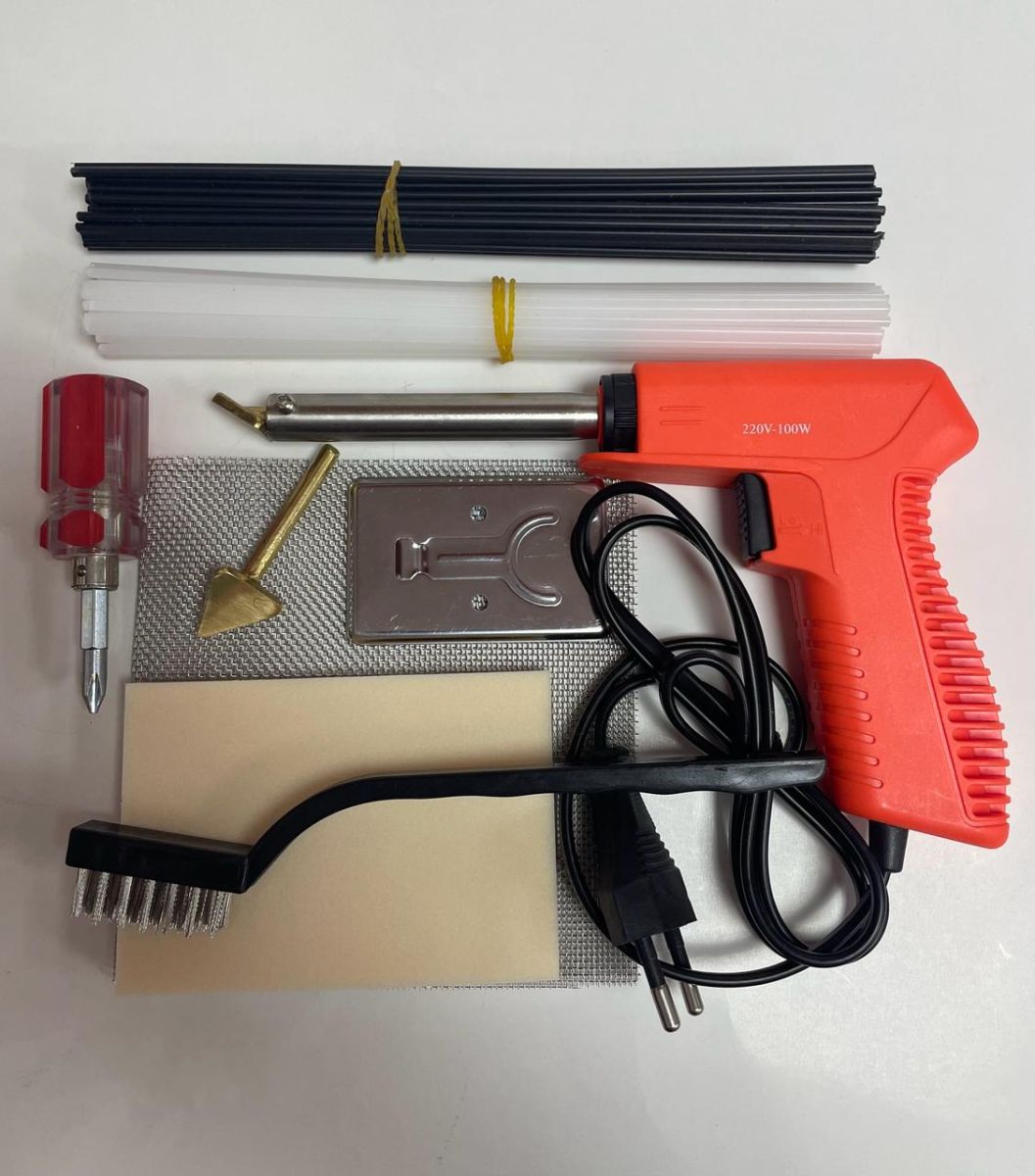 Паяльник для пайки пластика сеткой применяется для заделки сквозных отверстий в пластиковых деталях. Впаянная сетка служит каркасом для заполнения отверстия расплавленным пластиком. В набор помимо паяльника входит металлическая щетка для предварительной зачистки и сетки для пайки.